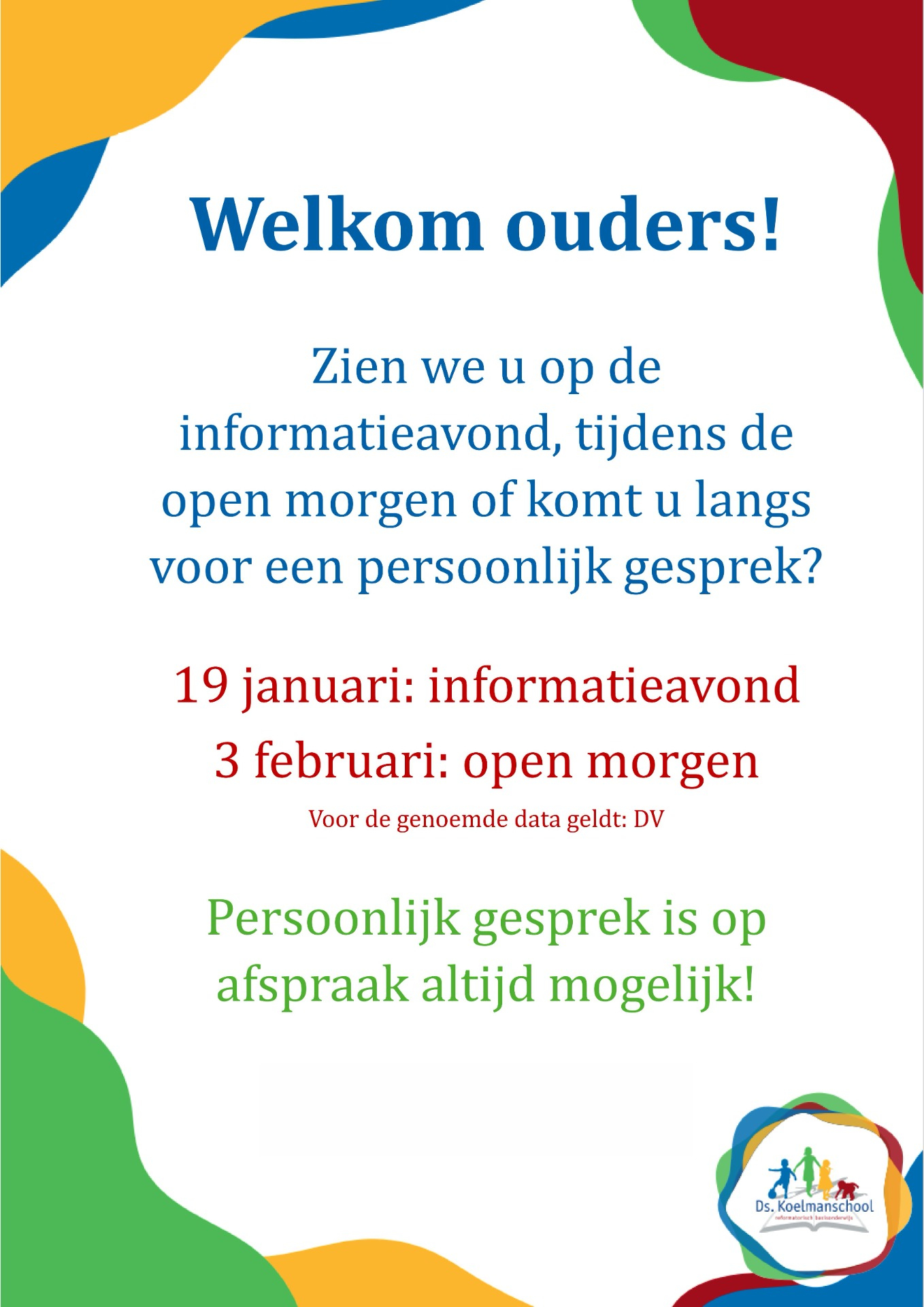 Ieder jaar organiseren we in januari/februari ook een informatieavond en een open morgen. Voor 2026 staat de informatieavond gepland op d.v. maandag 19 januari. Vanaf 19:30 bent u als ouders van harte welkom. Op deze avond vertellen we u, vanuit verschillende invalshoeken, alles over onze school!